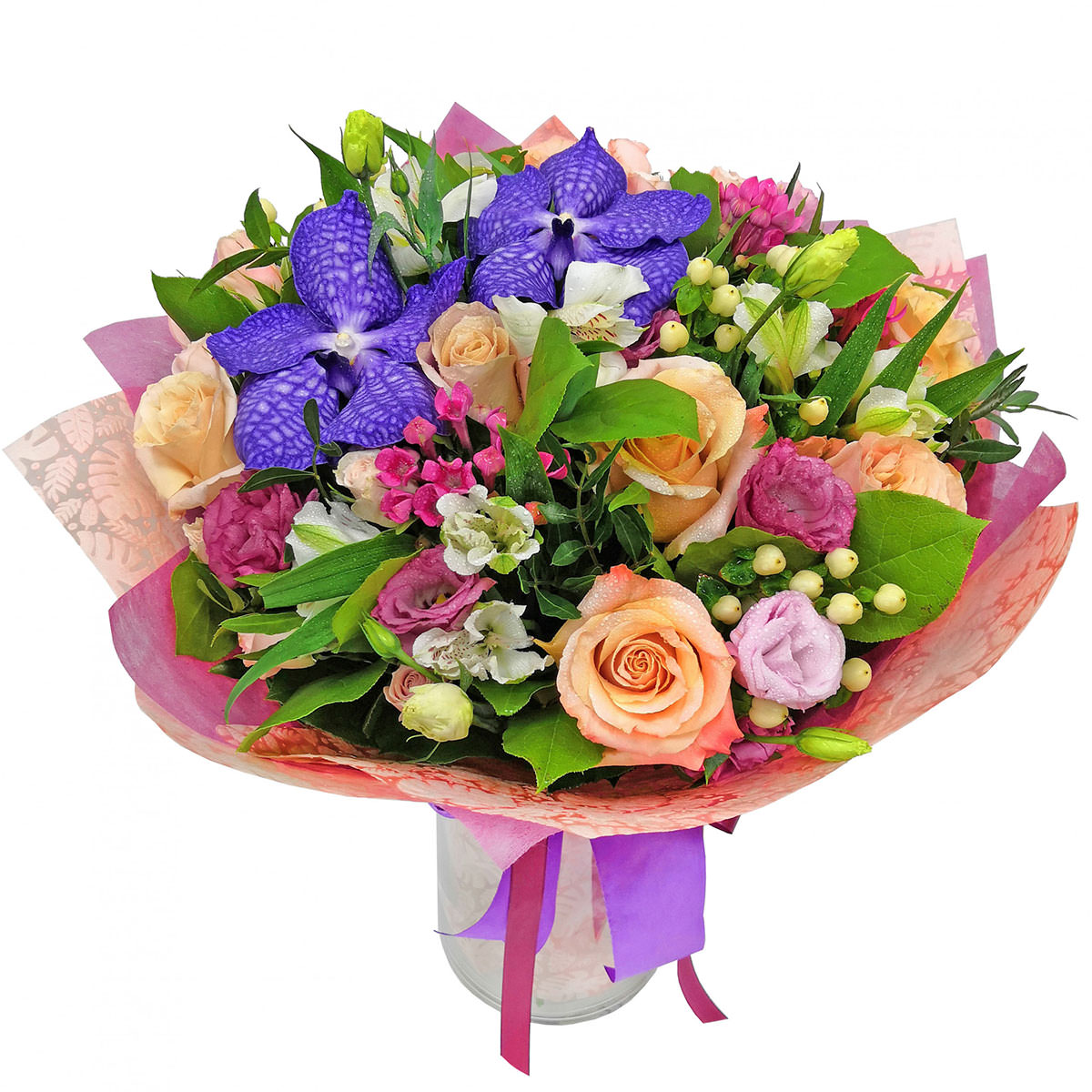 Ванда, роза одноголовая, альстромерия, эустома, бруния, эвкалипт.